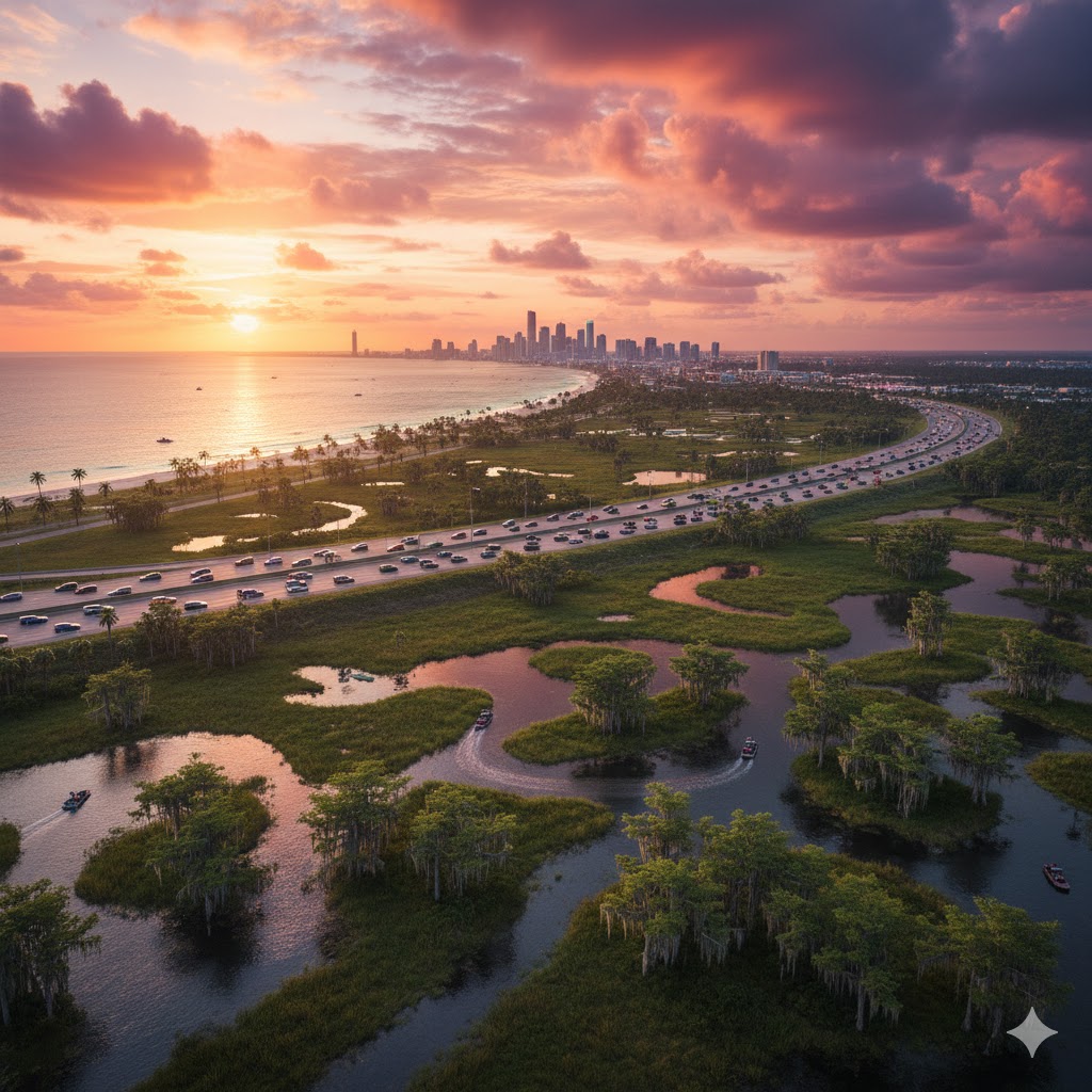 GTA 6 utspelar sig i Leonida, Rockstars satiriska och mörka version av Florida. Trailern visar solblekta motorvägar, träskmarker, nattklubbar, stränder, våld, galenskap, sociala medier-kultur, influencerhysteri och kriminalitet bakom perfekta fasader.